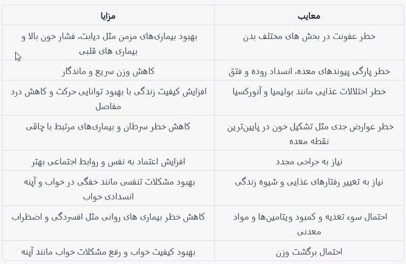 لازم به ذکر است که این جدول مزایا و معایب کلی جراحی باریاتریک است. پس ممکن است جراحی برای هر فرد بسته به وضعیت پزشکی و روحیه آنها، مزایا و معایب خاص خود را داشته باشد.