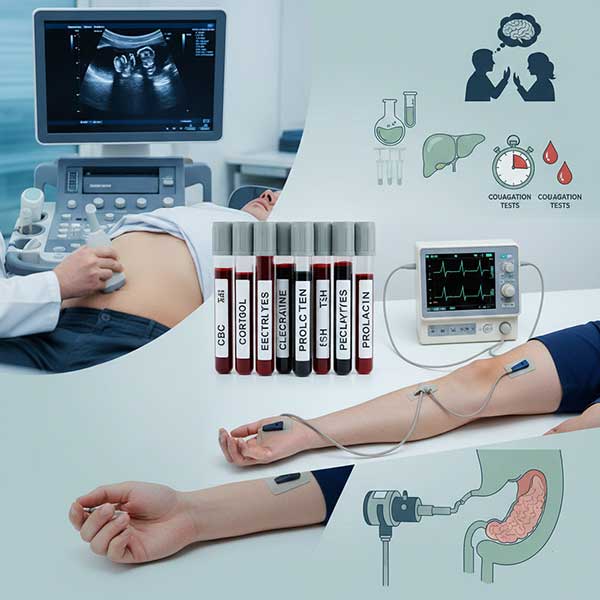 - آزمایشات خون شامل (CBC)، (BUN)، کورتیزول، کراتینین، الکترولیت ها، پرولاکتین و هورمون محرک تیروئید (TSH)
